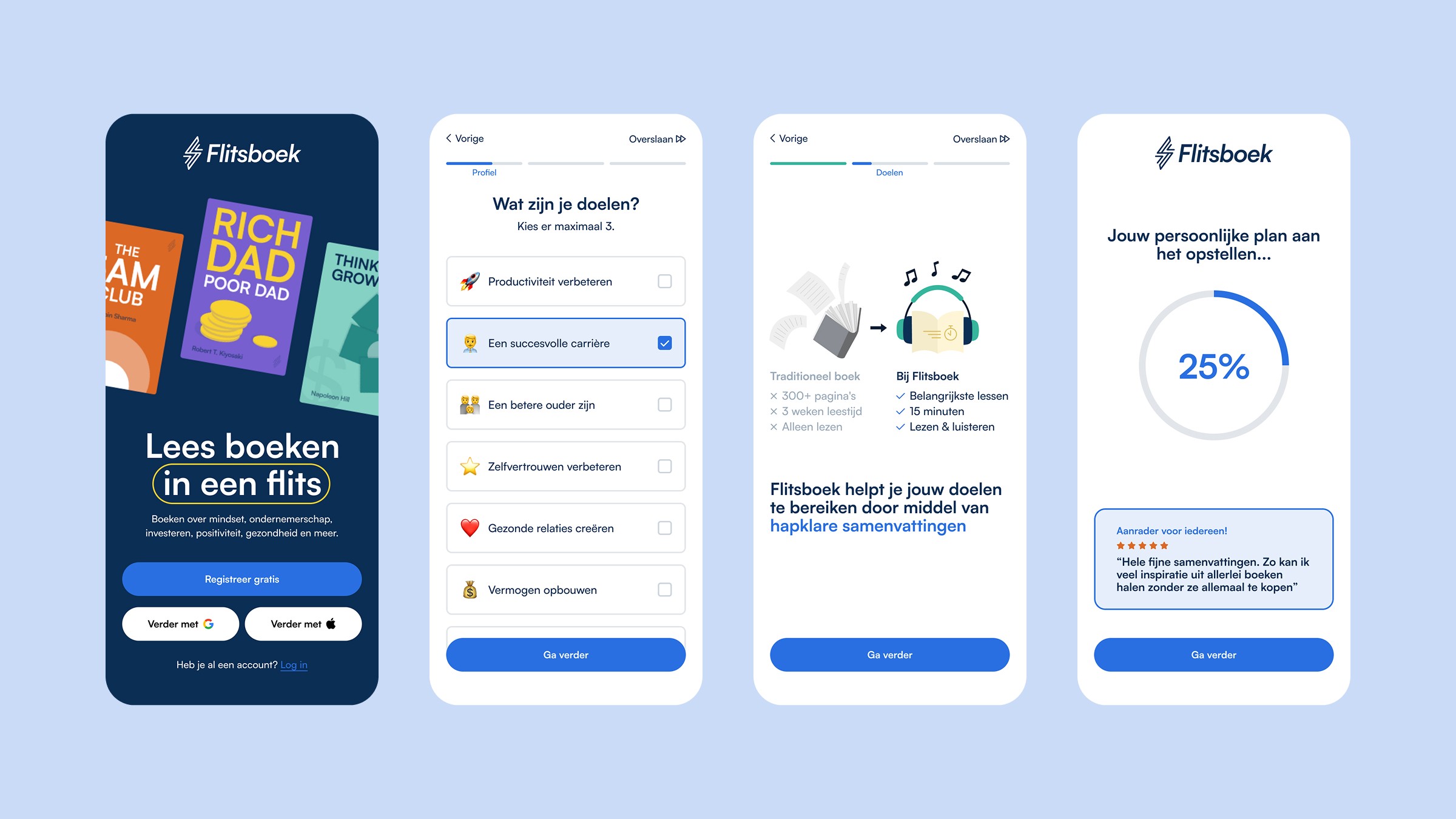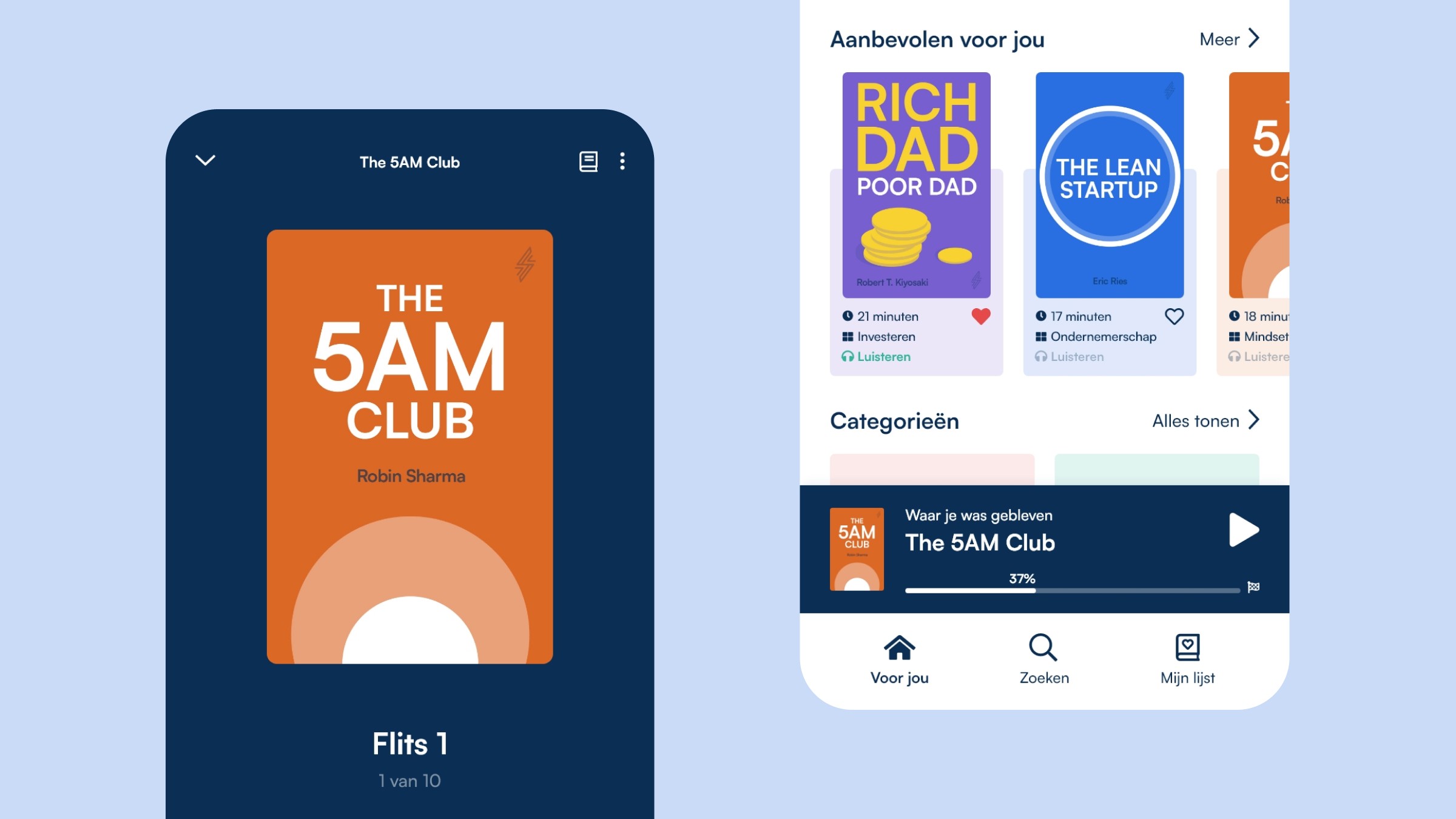 Met een frisse visuele stijl, intuïtieve navigatie en een soepele lees- en luisterervaring biedt Flitsboek zijn gebruikers een aantrekkelijke en gebruiksvriendelijke manier om snel nieuwe kennis op te doen. Daarbij lag onze focus niet alleen op visuals, maar ook op functionaliteit en gebruiksgemak, zodat de app in elke situatie prettig werkt.