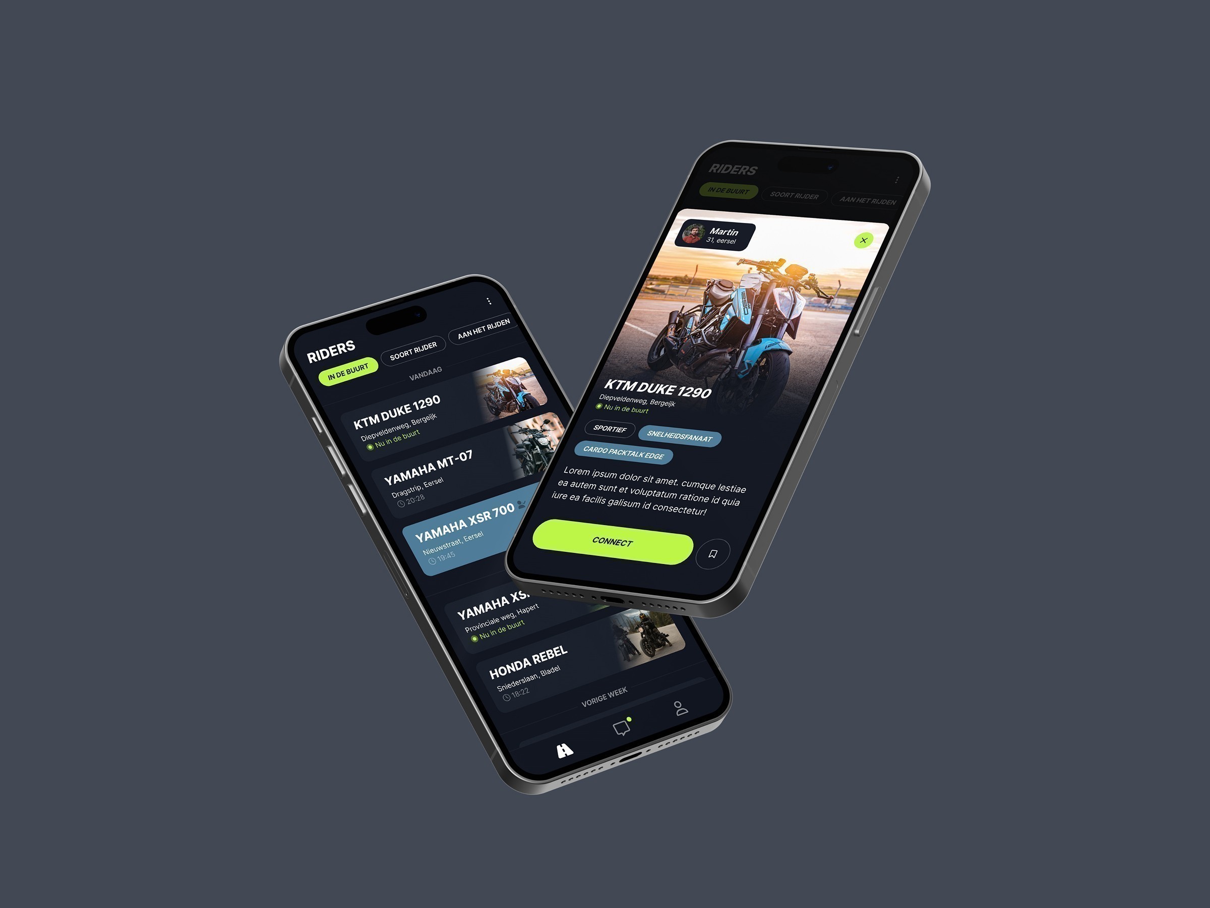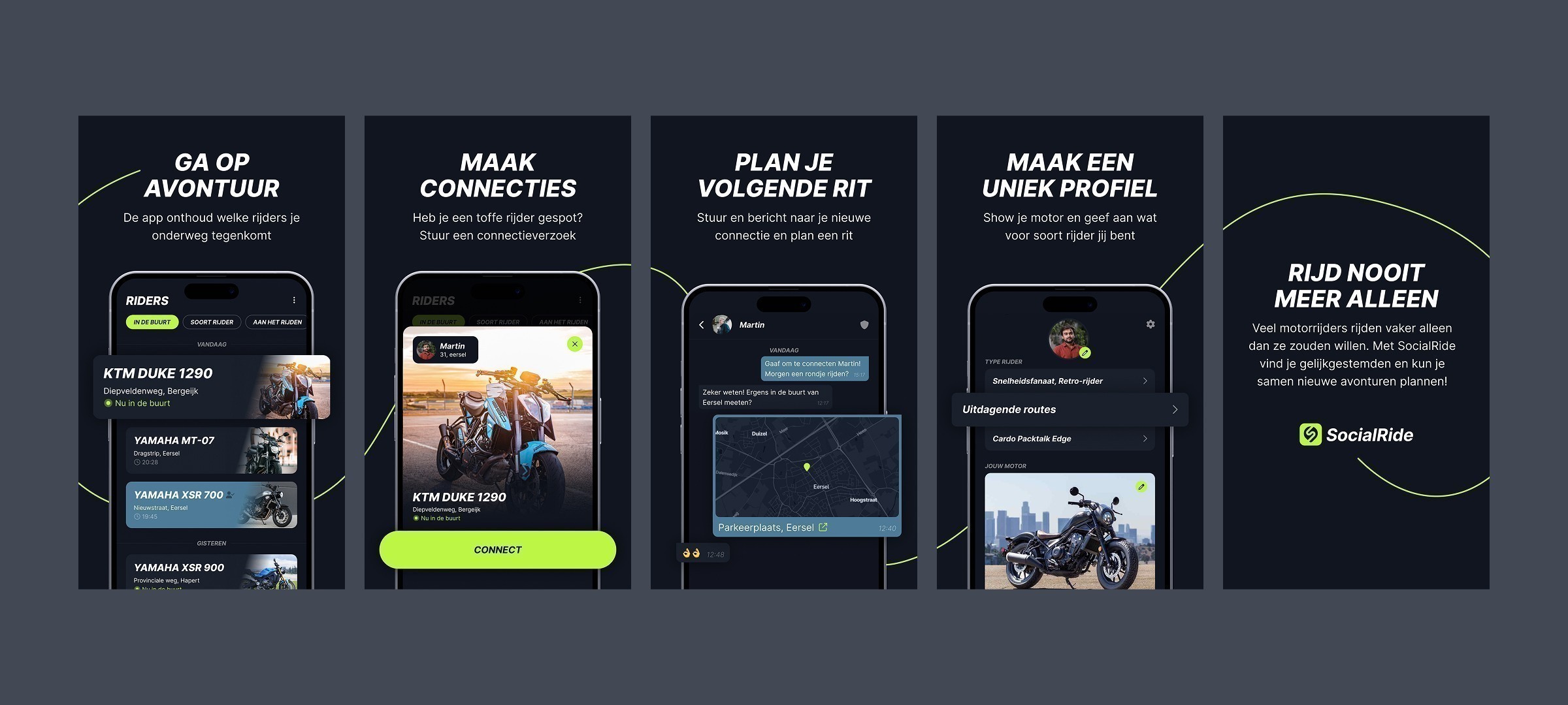 SocialRide is een app die motorrijders helpt om eenvoudig andere rijders te vinden, connecties te maken en samen ritten te plannen. Wij verzorgden de volledige branding en het UI/UX-design van de app, met een frisse en toegankelijke visuele stijl.